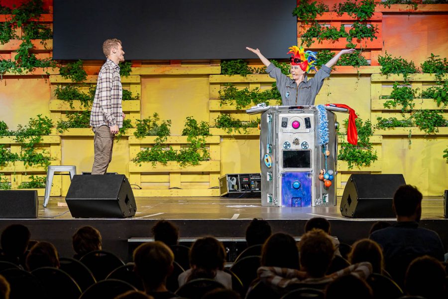 Der Weltraumbürger Galakto verfügt bisher über keine nennenswerten Erfahrungen im Umgang mit echten Menschen. Unvoreingenommen interessiert er sich für alle Themen der Schüler*innen und erhält von Luke auf der Schultheaterbühne eine Schulstunde der besonderen Art.